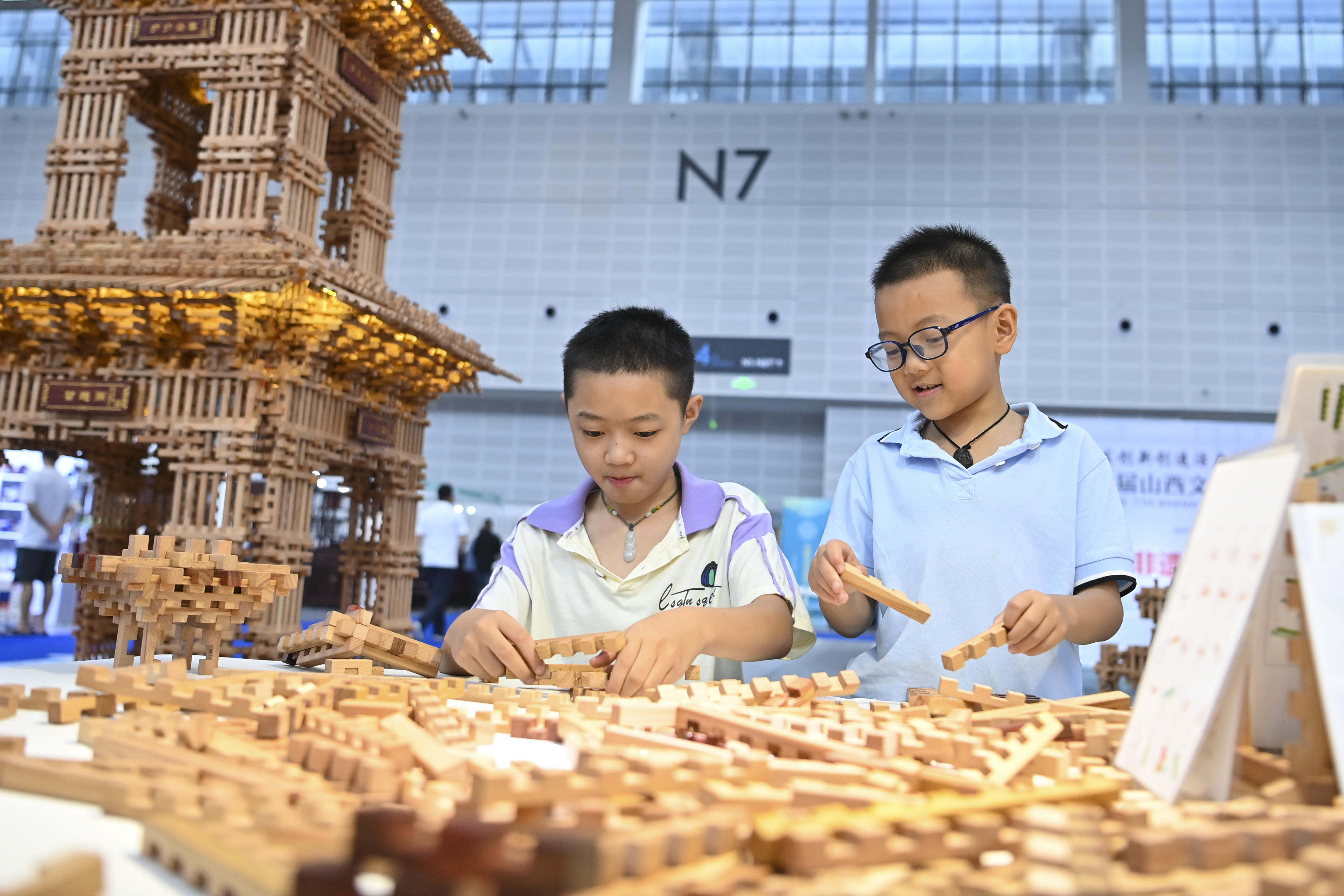 8月21日,两位小朋友在第七届山西文化产业博览交易会上体验榫卯积木拼搭。新华社记者 杨晨光 摄