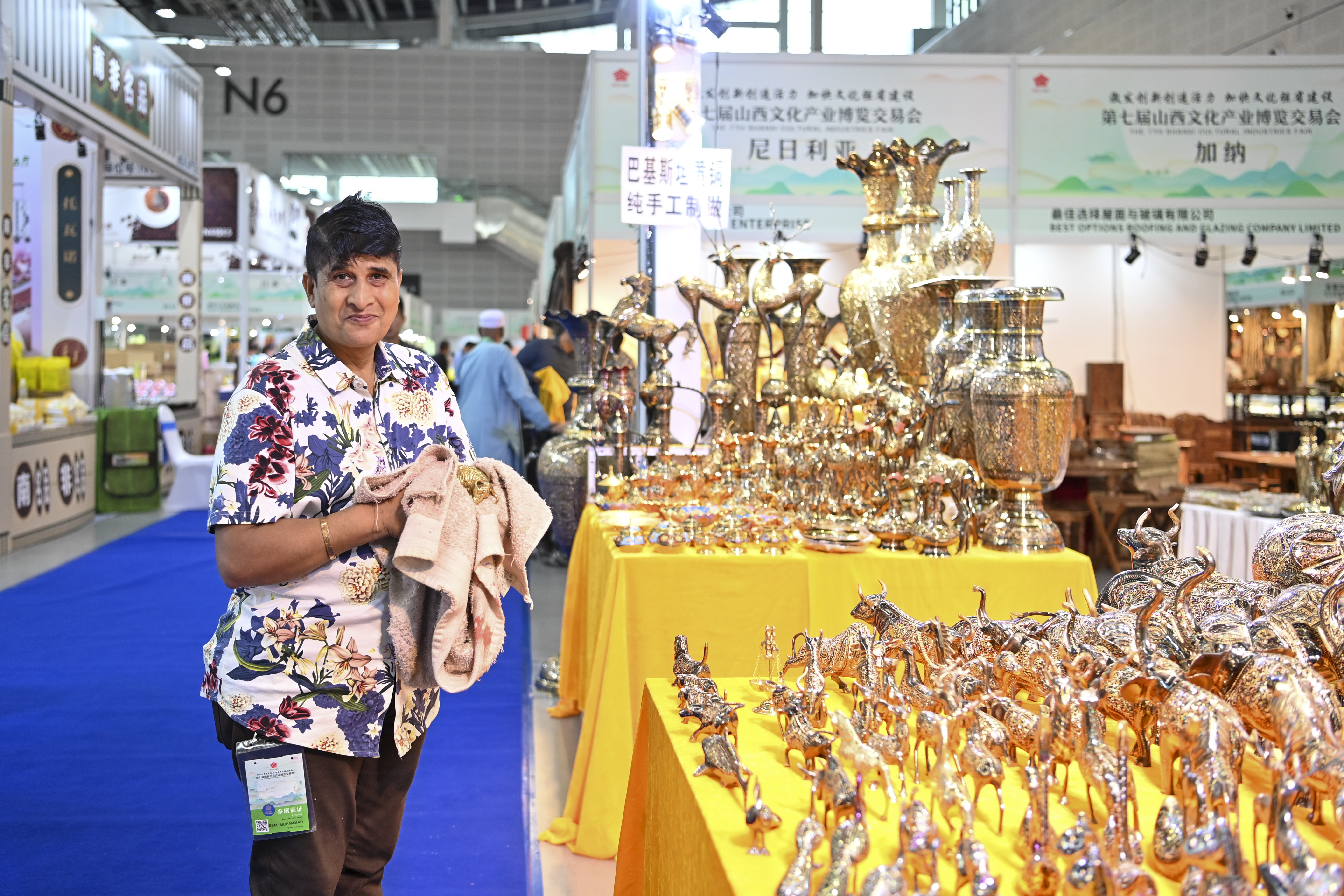 8月21日,一位参展商在第七届山西文化产业博览交易会上留影。新华社记者 杨晨光 摄