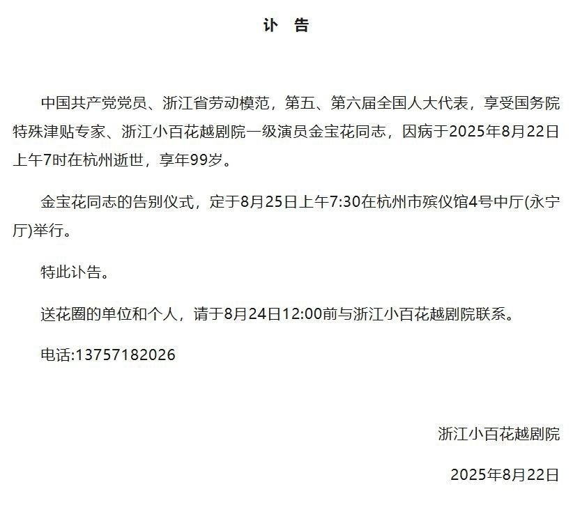 据浙江小百花越剧院消息,“浙江越剧五大小生”之一的金宝花因病于2025年8月22日上午7时在杭州逝世,享年99岁。