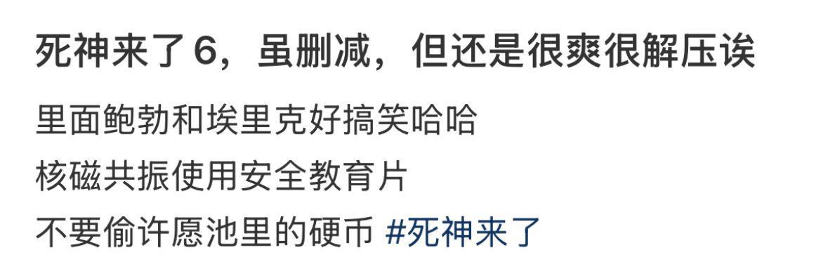 记者在多个社交平台看到,不少该IP的粉丝都在抱怨《死神来了6》“恐怖降级”,并详细列出哪些镜头被处理,调侃“这一部应该叫《死神来了又走了》”。