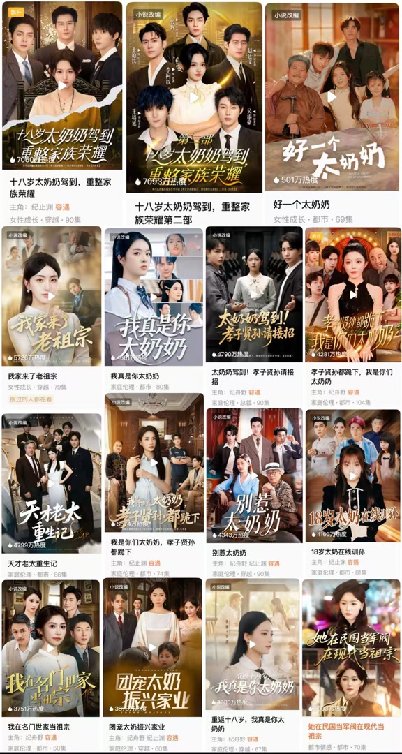 这种投资倾向反映到市场,就是不少观众感受到的,爆款短剧越来越像。“打开手机刷短剧,15个《前妻攻略》排队等着你。”观众晓丽向记者调侃道。原来,这一热门IP已被改编成现代都市版、民国传奇版、古装穿越版,甚至衍生出“修仙玄幻特别篇”。类似的还有《十八岁太奶奶驾到》,各大平台累计也有七八个版本,版本大同小异,“连女主角的发型都一模一样,一眼扫过去都分不清谁是谁。”