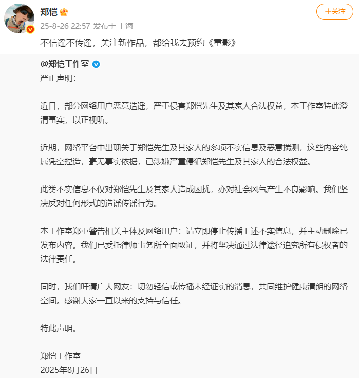 8月26日晚,“郑恺工作室”官方微博发声明回应称网络平台中出现关于郑恺先生及其家人的多项不实信息及恶意揣测,这些内容纯属凭空捏造,毫无事实依据,已涉嫌严重侵犯郑恺先生及其家人的合法权益。并已委托律师事务所全面取证。