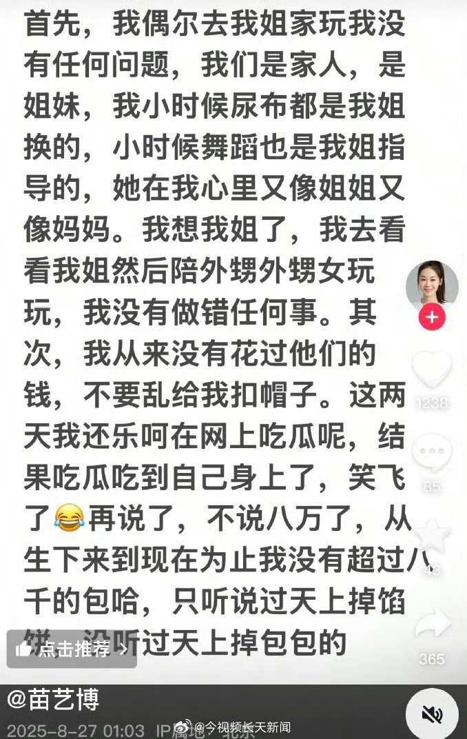 苗艺博表示:“首先,我偶尔去我姐家玩我没有任何问题,我们是家人,是姐妹,我小时候尿布都是我姐换的,小时候舞蹈也是我姐指导的,她在我心里又像姐姐又像妈妈。我想我姐了,我去看看我姐然后陪外甥外甥女玩玩,我没有做错任何事。其次,我从来没有花过他们的钱,不要乱给我扣帽子。这两天我还乐呵在网上吃瓜呢,结果吃瓜吃到自己身上了,笑飞了。再说了,不说八万了,从生下来到现在为止我没有超过八千的包哈,只听说过天上掉馅饼,没听过天上掉包包的。”