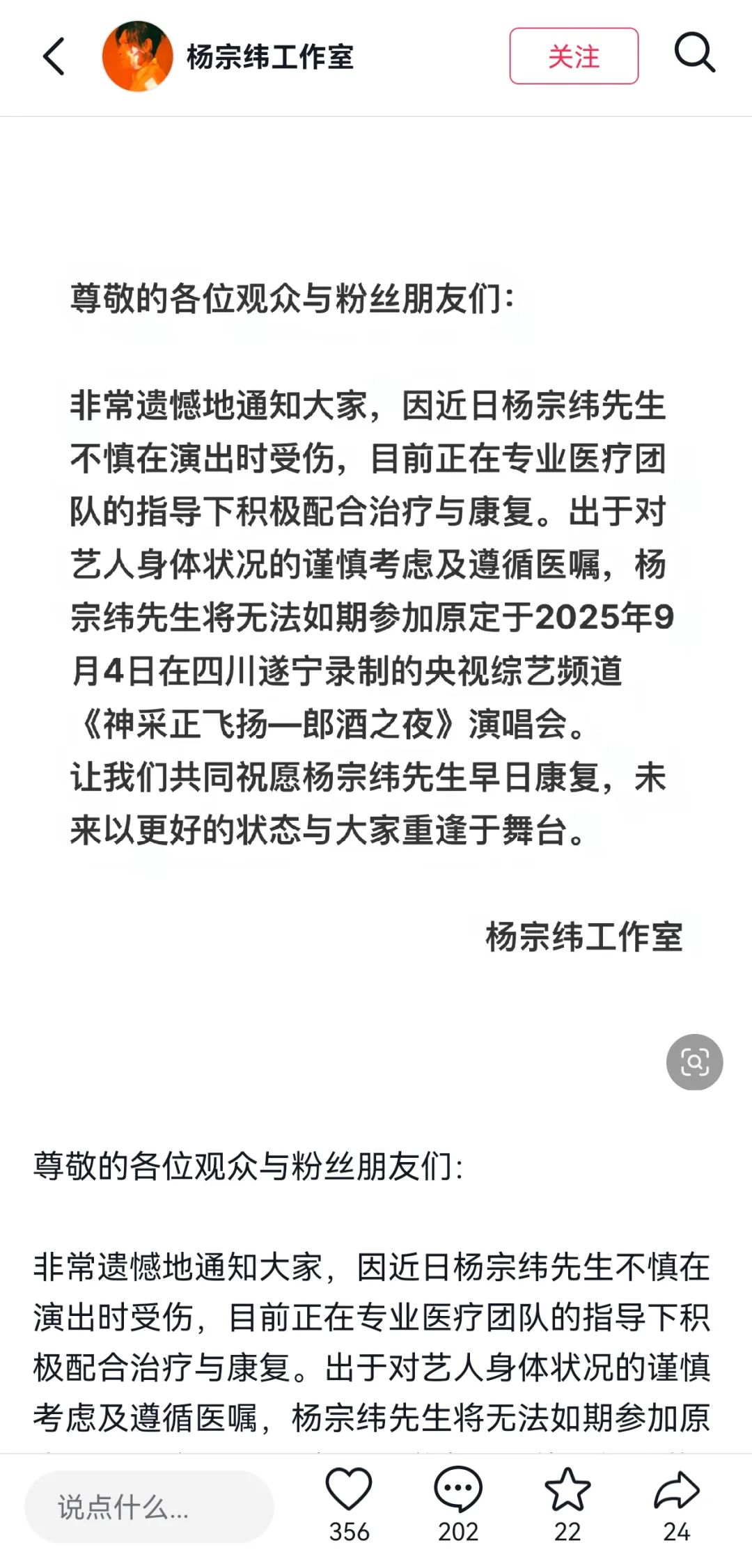 非常遗憾地通知大家,因近日杨宗纬先生不慎在演出时受伤,目前正在专业医疗团队的指导下积极配合治疗与康复。出于对艺人身体状况的谨慎考虑及遵循医嘱,杨宗纬先生将无法如期参加原定于2025年9月4日在四川遂宁录制的央视综艺频道《神采正飞扬一郎酒之夜》演唱会。让我们共同祝愿杨宗纬先生早日康复,未来以更好的状态与大家重逢于舞台。