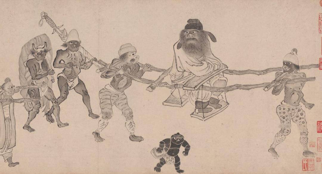 钟馗长什么样?我们现在很熟悉。但这副长相,一般认为到唐代才定下来。唐人卢肇在《唐逸史》中讲述了一则唐明皇的故事:唐明皇病重,“俄见一大鬼破帽蓝袍,角带朝靴,捉小鬼刳其目,劈而啖之”。他自称“终南进士钟馗”,因应举不第,触阶而死,明皇赐绿袍以葬,他感恩发誓,“为除虚耗妖孽之事”。第二天唐明皇病就好了,让吴道子根据他的口述将钟馗画像画下来。此后,明皇昭告天下,图绘钟馗,以祛邪魅。