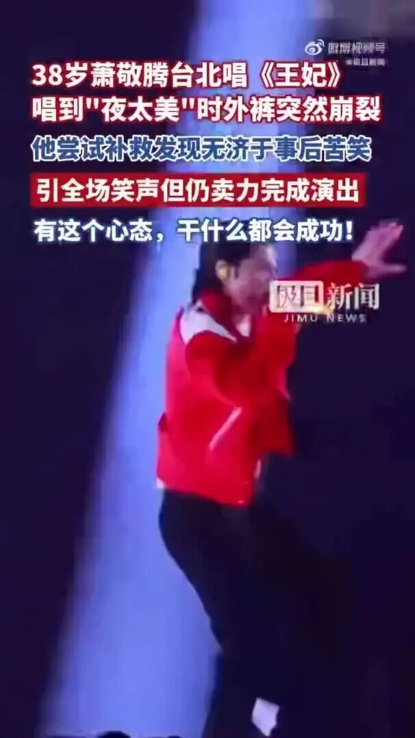 现场视频显示,显然意识到裤子崩裂的萧敬腾先是低头去查看情况,后尝试提高裤腰整理,但发现无济于事又无法暂停演出后,他先是苦笑而后大方继续开唱,同时并未因这突如其来的尴尬而降低演出的精彩。