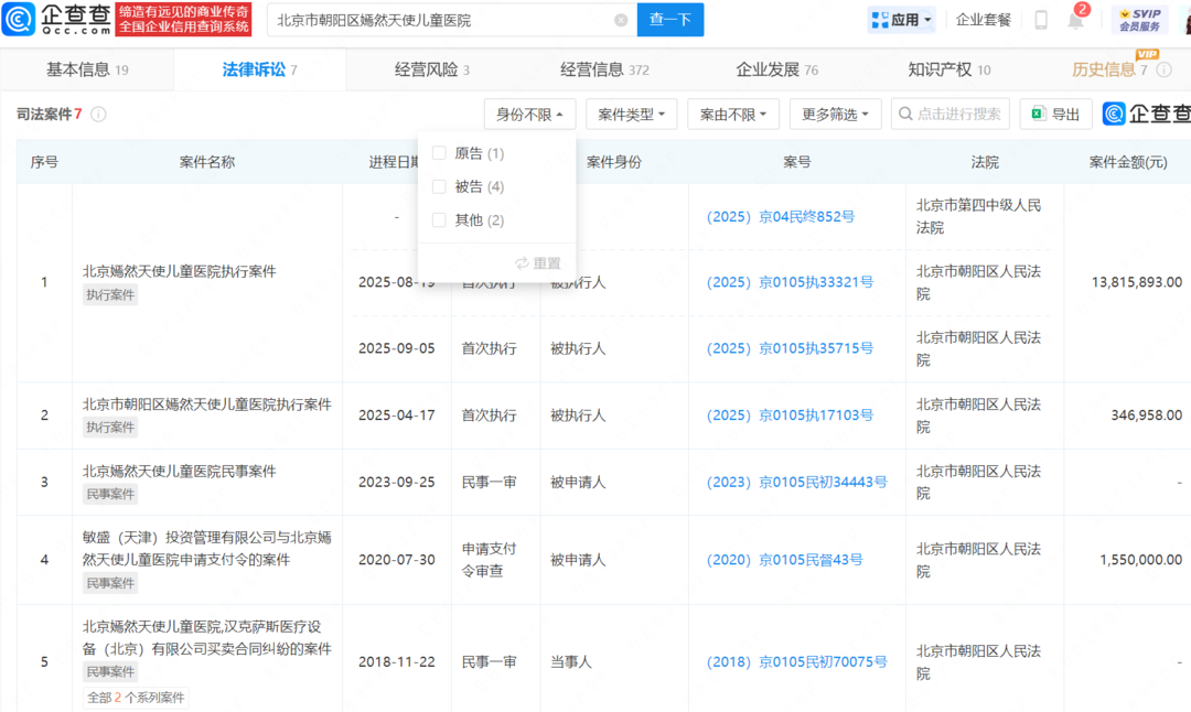 近日,北京市朝阳区嫣然天使儿童医院新增一则被执行人信息,执行标的1381万余元,执行法院为北京市朝阳区人民法院。