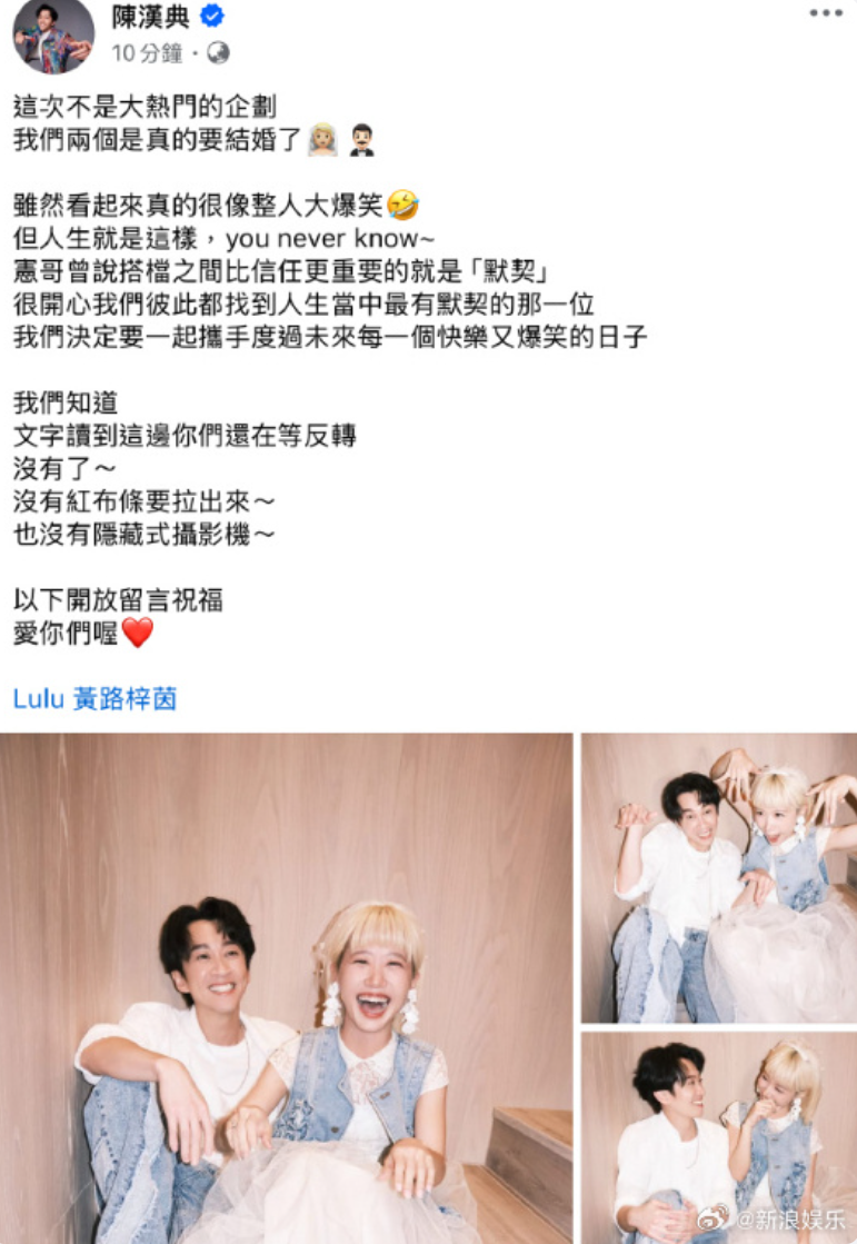 陈汉典晒出多张合照,并配文:这次不是大热门的企划,我们两个是真的要结婚了!虽然看起来真的很像“整人大爆笑”,但人生就是这样,you never know~