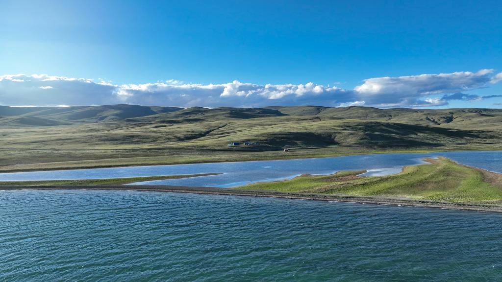7月25日拍摄的尕日塘秦刻石所在地青海省果洛藏族自治州玛多县扎陵湖北岸(无人机照片)。新华社记者 杜笑微 摄