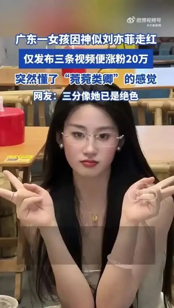 9月16日,广东一女孩因神似刘亦菲走红,五官脸型都十分相像,截至目前仅发布4条视频便涨粉20万,突然懂了“菀菀类卿”的感觉,网友:三分像她已是绝色。
