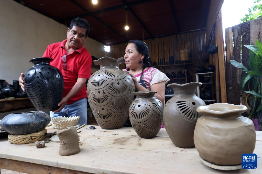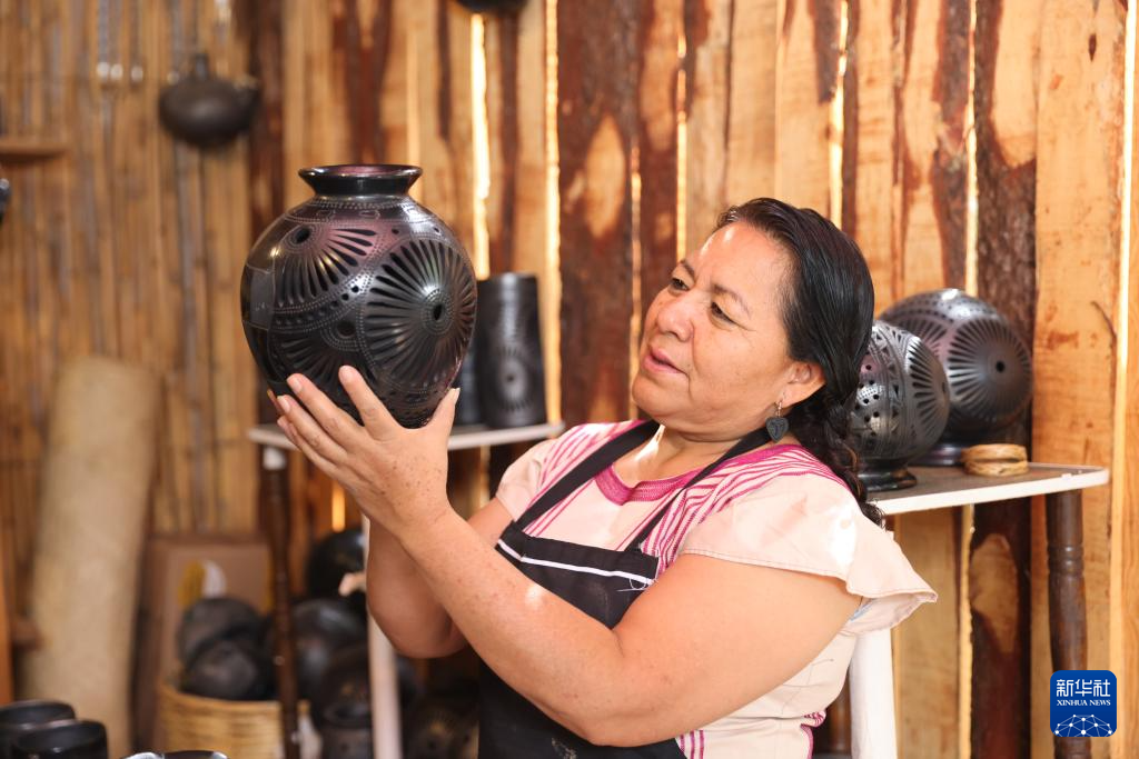9月14日,在墨西哥瓦哈卡州的圣巴托洛科约特佩克市,黑陶手工艺者展示不同步骤下的黑陶制品。