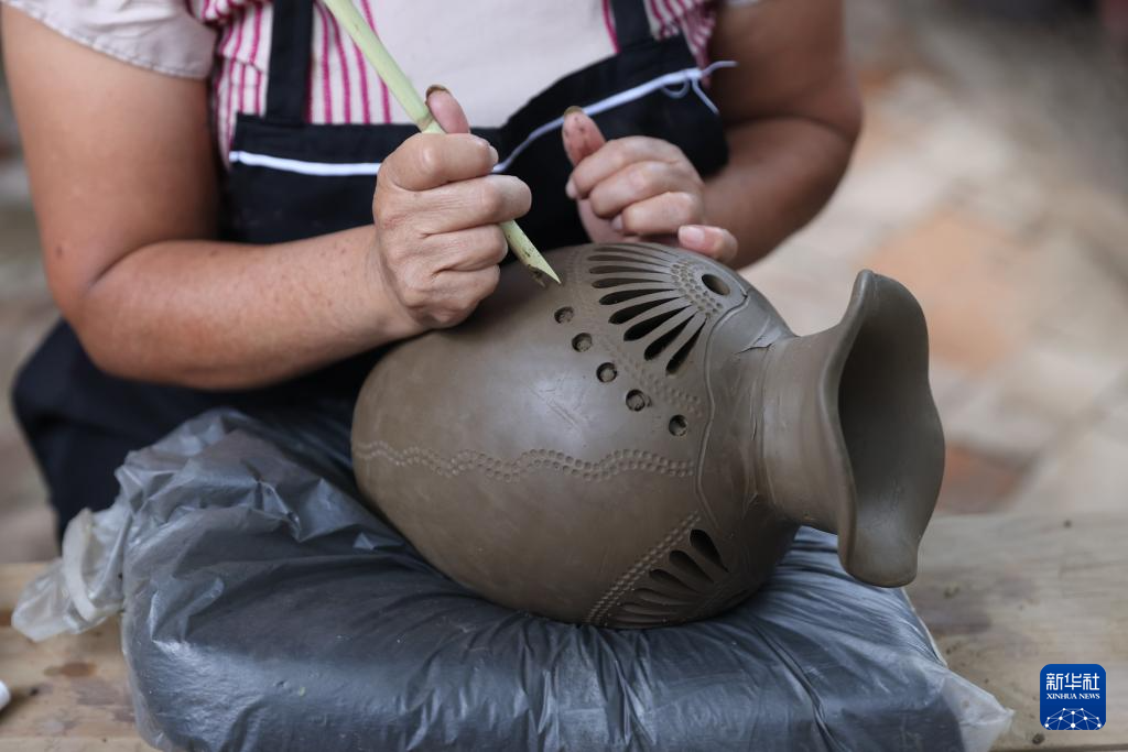 9月14日,在墨西哥瓦哈卡州的圣巴托洛科约特佩克市,一名黑陶手工艺者进行雕刻镂空。