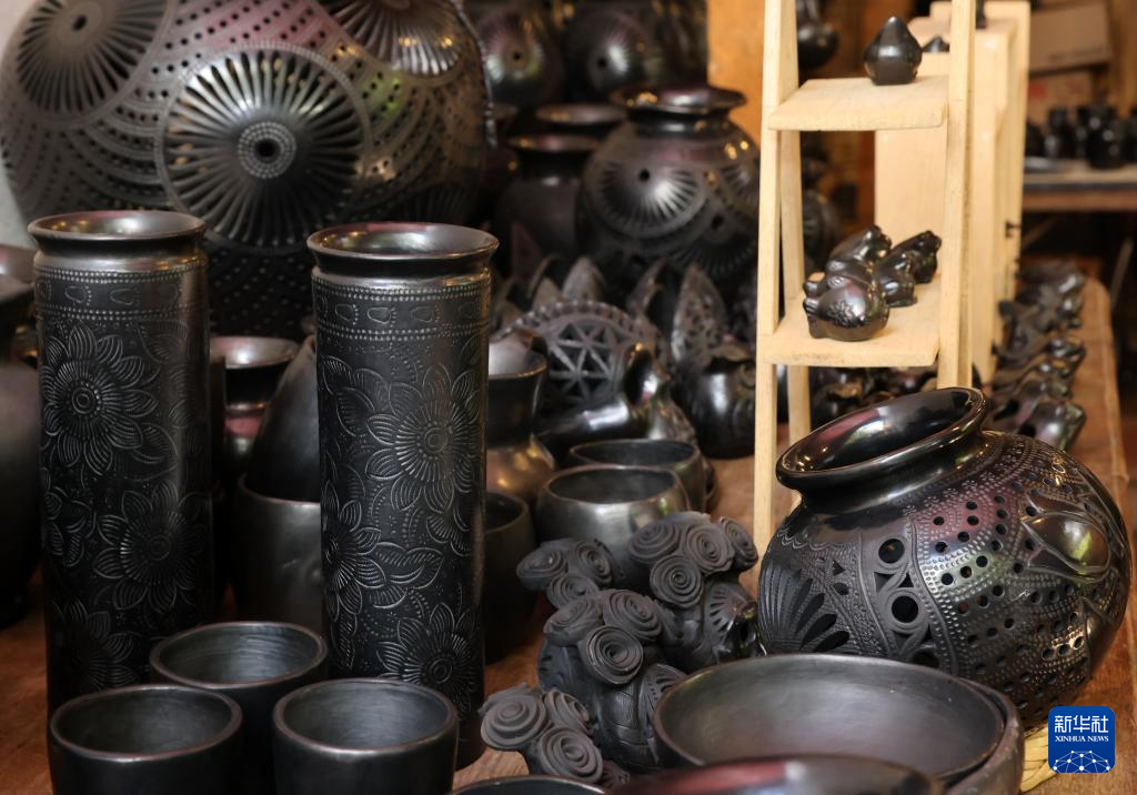 这是9月14日在墨西哥瓦哈卡州的圣巴托洛科约特佩克市一处黑陶工坊拍摄的黑陶制品。
