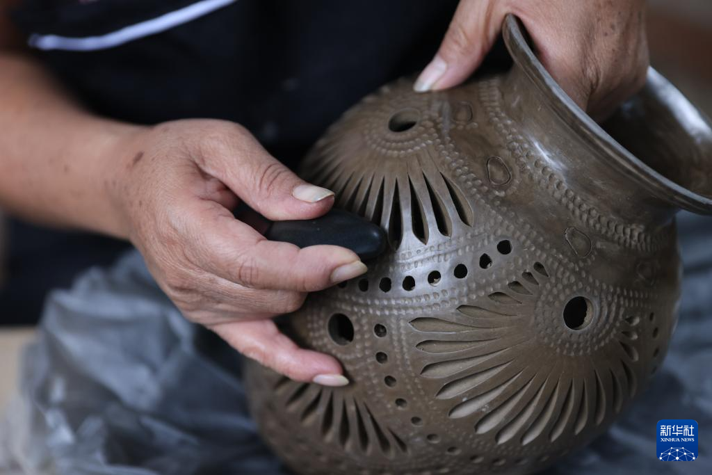 9月14日,在墨西哥瓦哈卡州的圣巴托洛科约特佩克市,一名黑陶手工艺者给陶罐进行抛光。