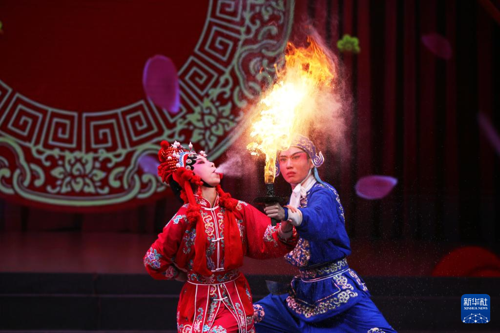 9月13日晚,在定西市陇中许铁堂秦腔剧院,演员表演秦腔绝活“吹火”。
