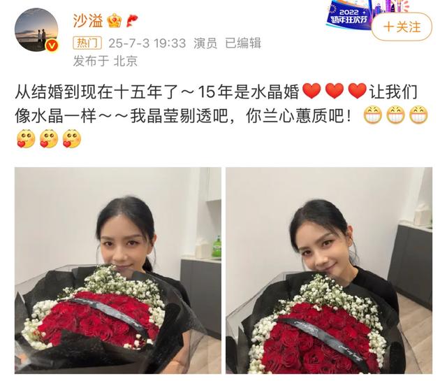 今年7月3日,沙溢发文庆祝与妻子胡可结婚15周年。