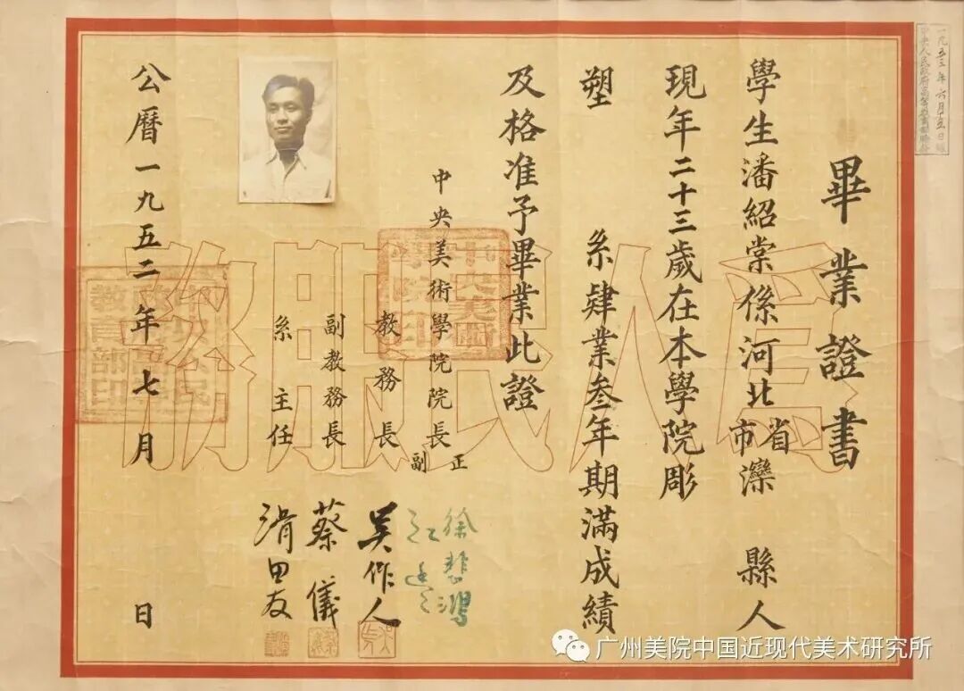 潘绍棠1952年获得由徐悲鸿等签发的中央美院毕业证书