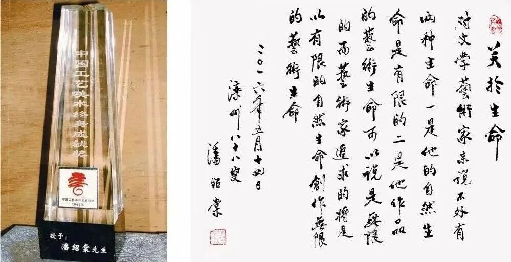 2006年,潘绍棠在宁波举行的“中国工艺美术终身成就奖”颁奖仪式(右为郑兴国秘书长)