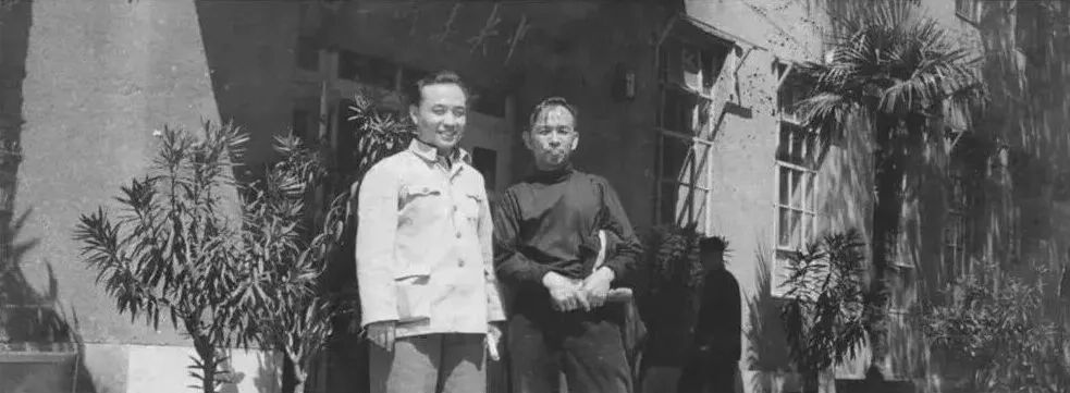 1954年,潘绍棠在中央美院王府井旧址楼前,与中国台湾雕塑家范文龙先生合影