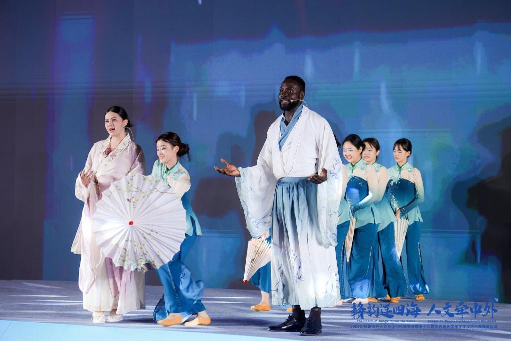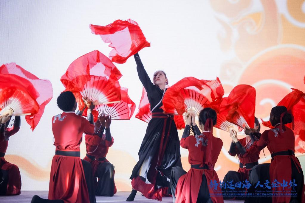 “筑梦赣鄱”篇章,歌舞情景剧《同桌的你》温馨演绎了中外学子的深厚情谊;街舞《文化之桥》动感十足,展现了跨越国界的艺术碰撞;《迦陵频伽》优美灵动,仿佛从敦煌壁画中走来,令人沉醉。
