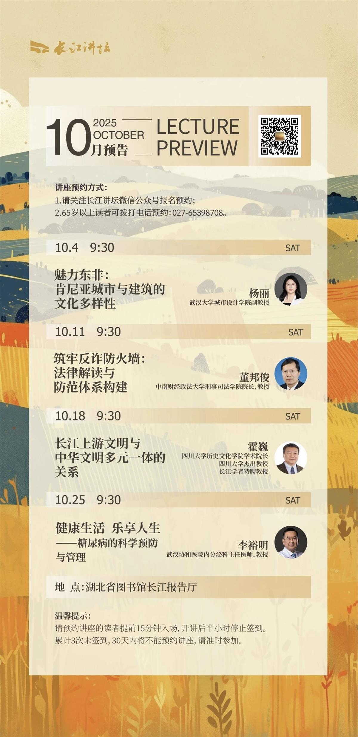 2025年10月,长江讲坛安排讲座四场,具体主题和时间如下——
