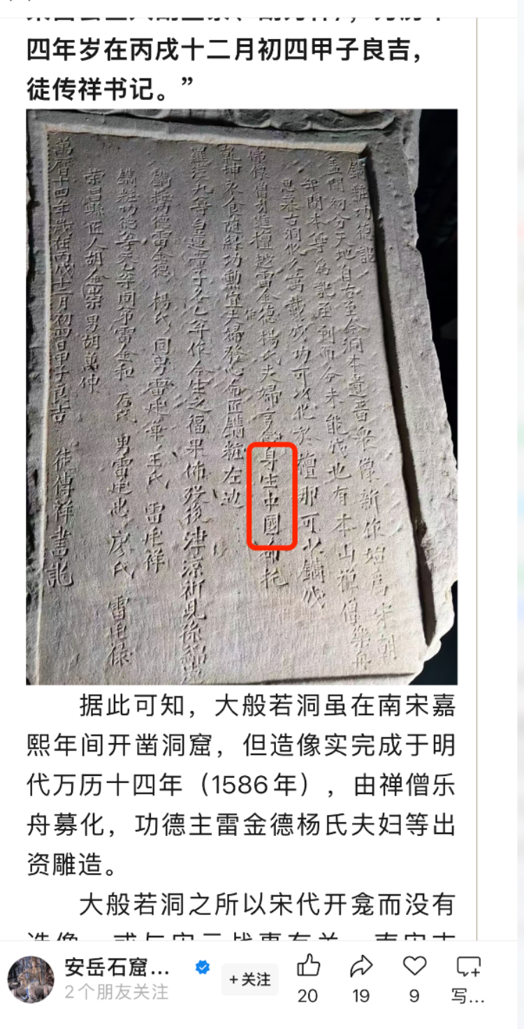 记者从安岳石窟研究院微信公众号9月18日发布的文章《华严洞大般若洞开龛与造像年代小析》文章看到,华严洞位于安岳县城东南五十公里的石羊镇华严村箱盖山,属全国重点文物保护单位。该处开凿有两座洞窟,分别为华严洞与大般若洞,其中大般若洞虽开凿于南宋嘉熙年间,但造像与题记完成于明代。“身生中国”一语,出自大般若洞洞口左侧题记《镌粧功德记》,现仍清晰可辨。