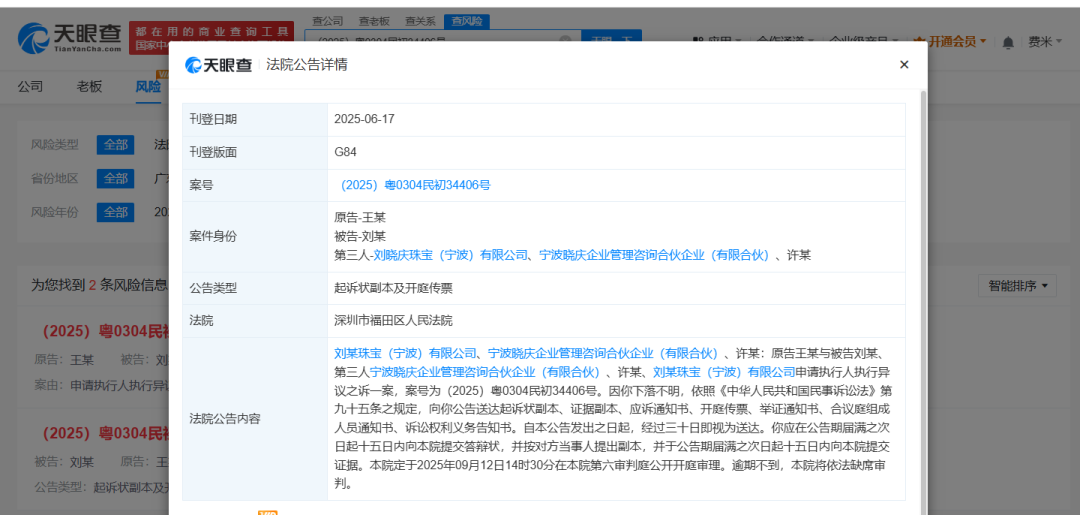 据天眼查,深圳市福田区人民法院向宁波晓庆企业管理咨询合伙企业(有限合伙)、许某、刘晓庆珠宝(宁波)有限公司公告送达王某与刘晓庆等申请执行人执行异议之诉一案起诉状副本及证据副本、应诉通知书、开庭传票等,自公告之日起30日即视为送达,并定于9月12日开庭审理。