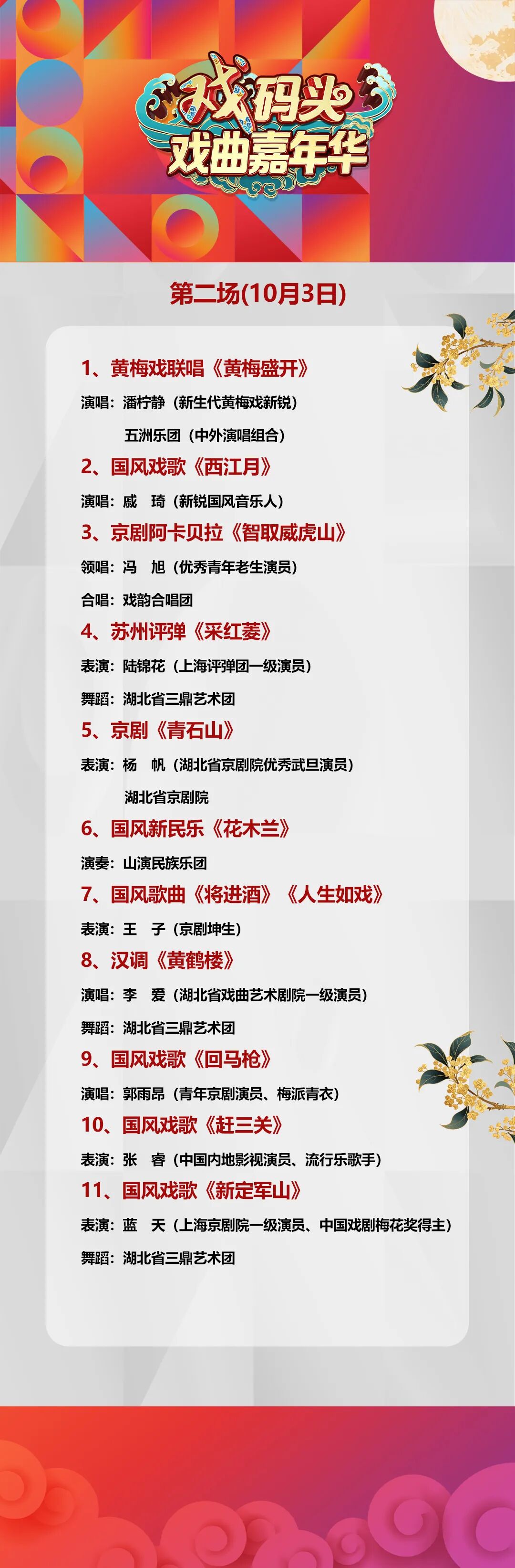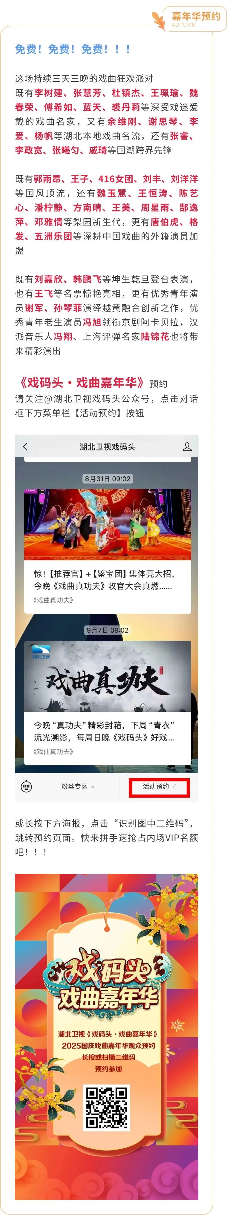 遗憾告诉您,第一场已经满额…… 首场节目单一公开 戏迷粉丝热情值迅速拉满 第一场预约人数瞬间满额 后两场预留名额也所剩无几 不想错过此次嘉年华的朋友们抓紧了 赶快预约起来 《戏码头》在此声明 《戏码头·戏曲嘉年华》 为国庆惠民文旅活动 免费!免费!!免费!!! 禁止一切“售卖”行为哦 还在纠结行程的朋友 不知可曾听过一句话: “此生必来大武汉” 来武汉则必看《戏码头》 尤其是首次走出演播厅的 《戏曲嘉年华》 倒计时2天 先预约,再出发 剩下的就交给《戏码头》吧 【全球首发】 ↓↓↓↓↓↓↓ 《戏码头·戏曲嘉年华》 第二场节目单+嘉宾海报大公开 预约了本场的朋友 请右键保存哦 才登黄鹤楼,又看戏码头 武汉之行,文化之旅 国庆戏码头嘉年华 期待大家的到来