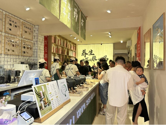 2025年8月1日,耐养森活·江南药镇草本茶饮店新店在浙江省东阳市开张。新华网发(黄莉萍摄)