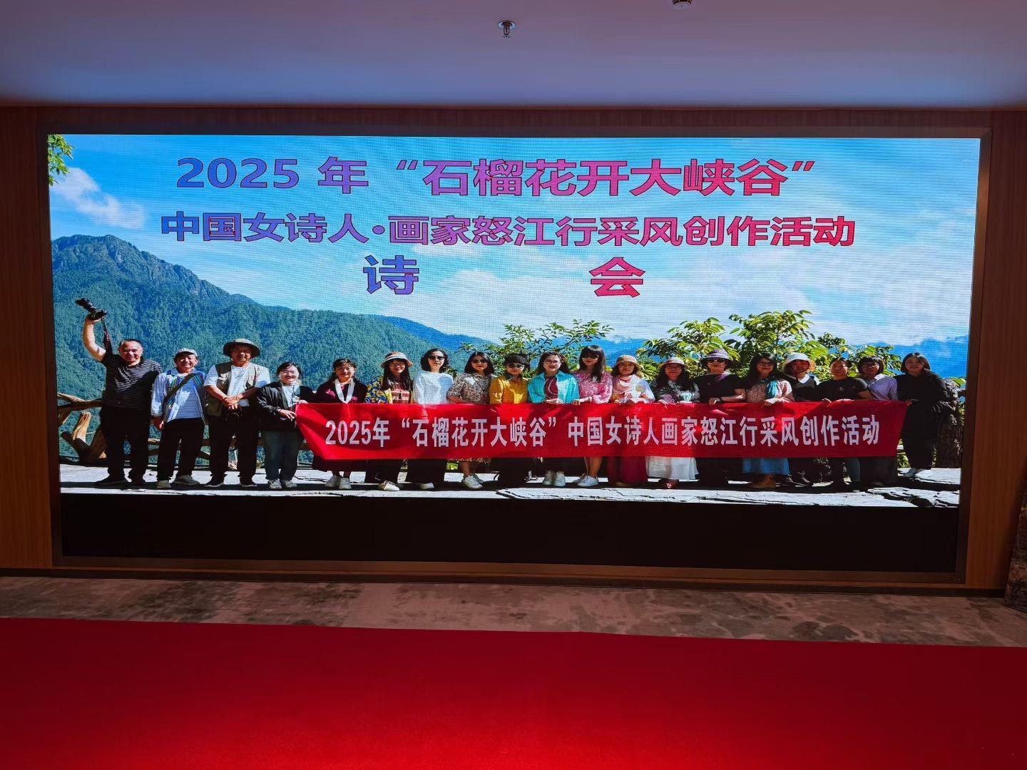 9月27日,由云南怒江州文联等主办的2025年“石榴花开大峡谷”中国女诗人画家怒江行采风创作活动在泸水市举行座谈会。海男、花语、安琪、施施然、三色堇、暖玉、阿毛、海惠、杨荟、赵晓梅、宋德丽等来自北京、河北、西安、武汉、云南等地的11位艺术家,以及怒江州市有关部门负责同志、文学爱好者齐聚一堂,共话艺术创作与民族团结融合成果。