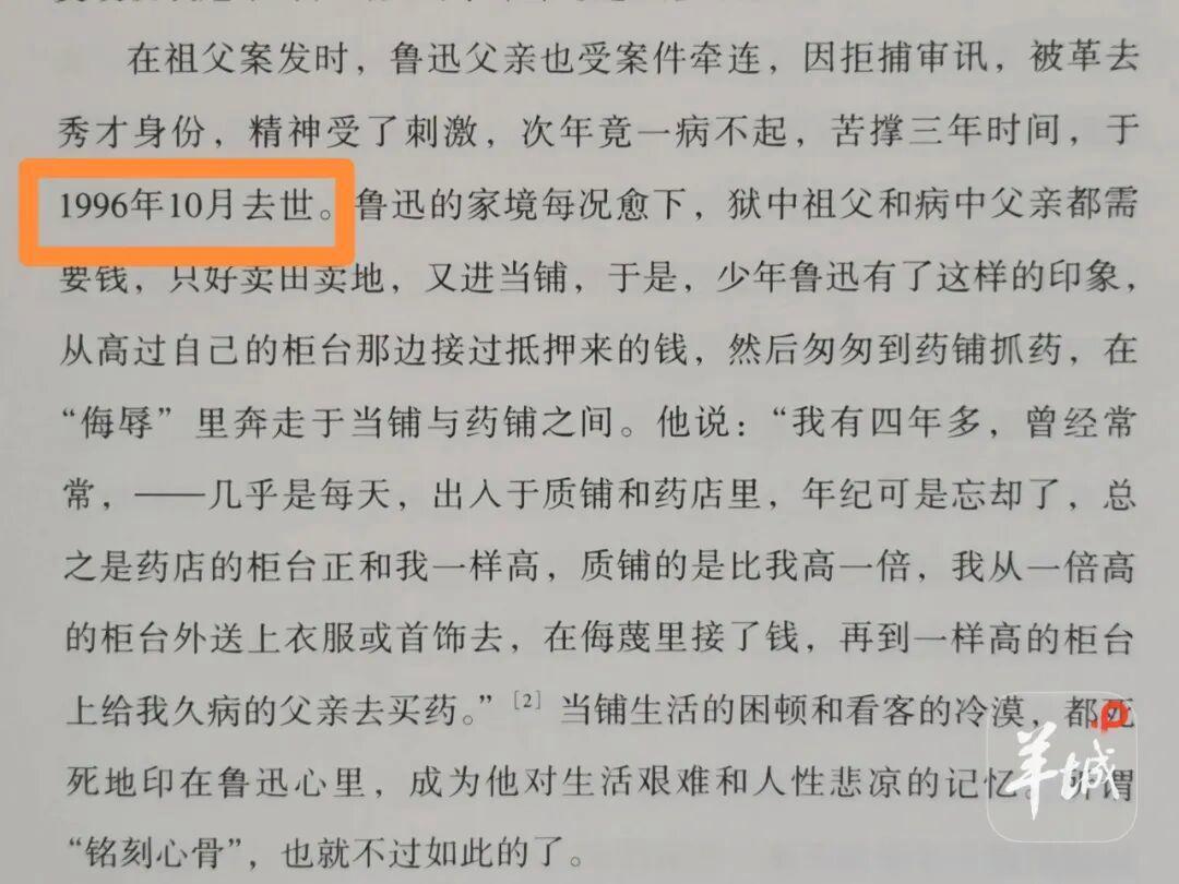 9月30日,记者在图书馆中找到该书,看到该书第5页写道:“在祖父案发时,鲁迅父亲也受案件牵连,因拒捕审讯,被革去秀才身份,精神受了刺激,次年竟一病不起,苦撑三年时间,于1996年10月去世。”