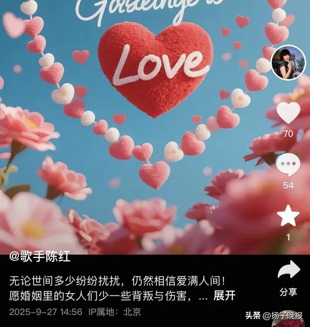 9月27日,陈红发文称,“无论世间多少纷纷扰扰,仍然相信爱满人间!愿婚姻里的女人们少一些背叛与伤害,愿男人多一些责任与担当,常回家看看!”