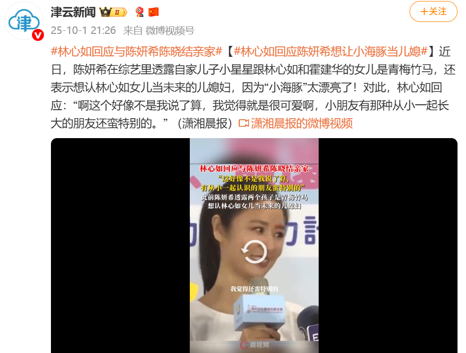 10月2日,#林心如回应与陈妍希陈晓结亲家#冲上微博热搜。