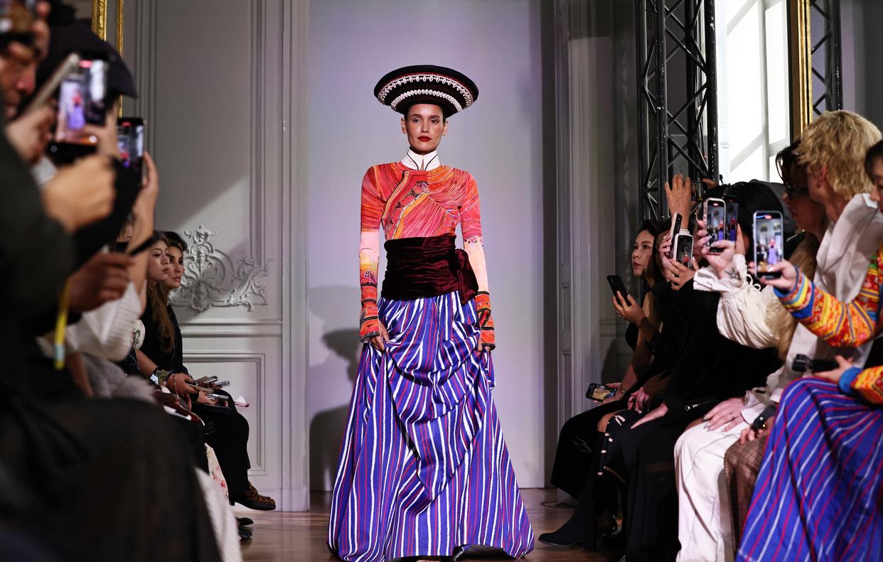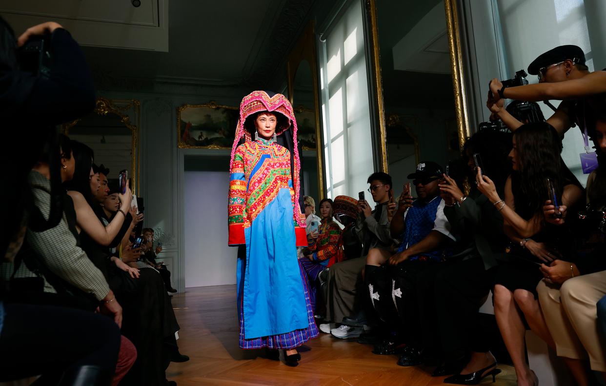 10月1日,在法国巴黎中国文化中心举行的第三届中法时装周上,模特在“非遗四川·百城百艺”盐边·傈僳族服饰时尚秀上展示服装。新华社记者 高静 摄