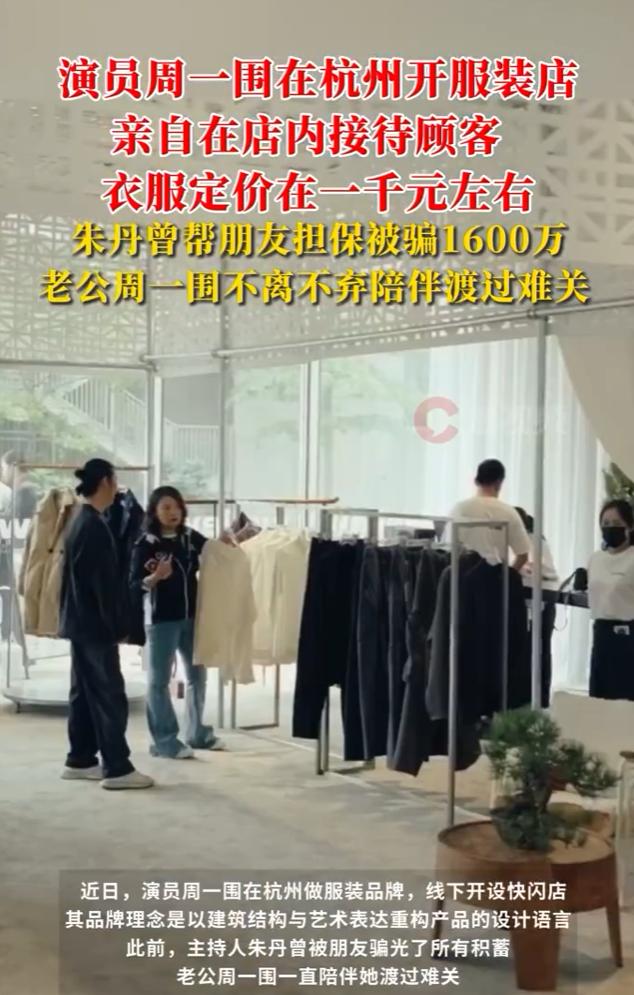 近日,演员周一围在杭州做服装品牌,线下开设快闪店,其品牌理念是以建筑结构与艺术表达重构产品的设计语言,亲自在店内接待顾客,衣服定价大多在一千元左右。此前,主持人朱丹曾被朋友骗光了所有积蓄,老公周一围一直陪伴她渡过难关。