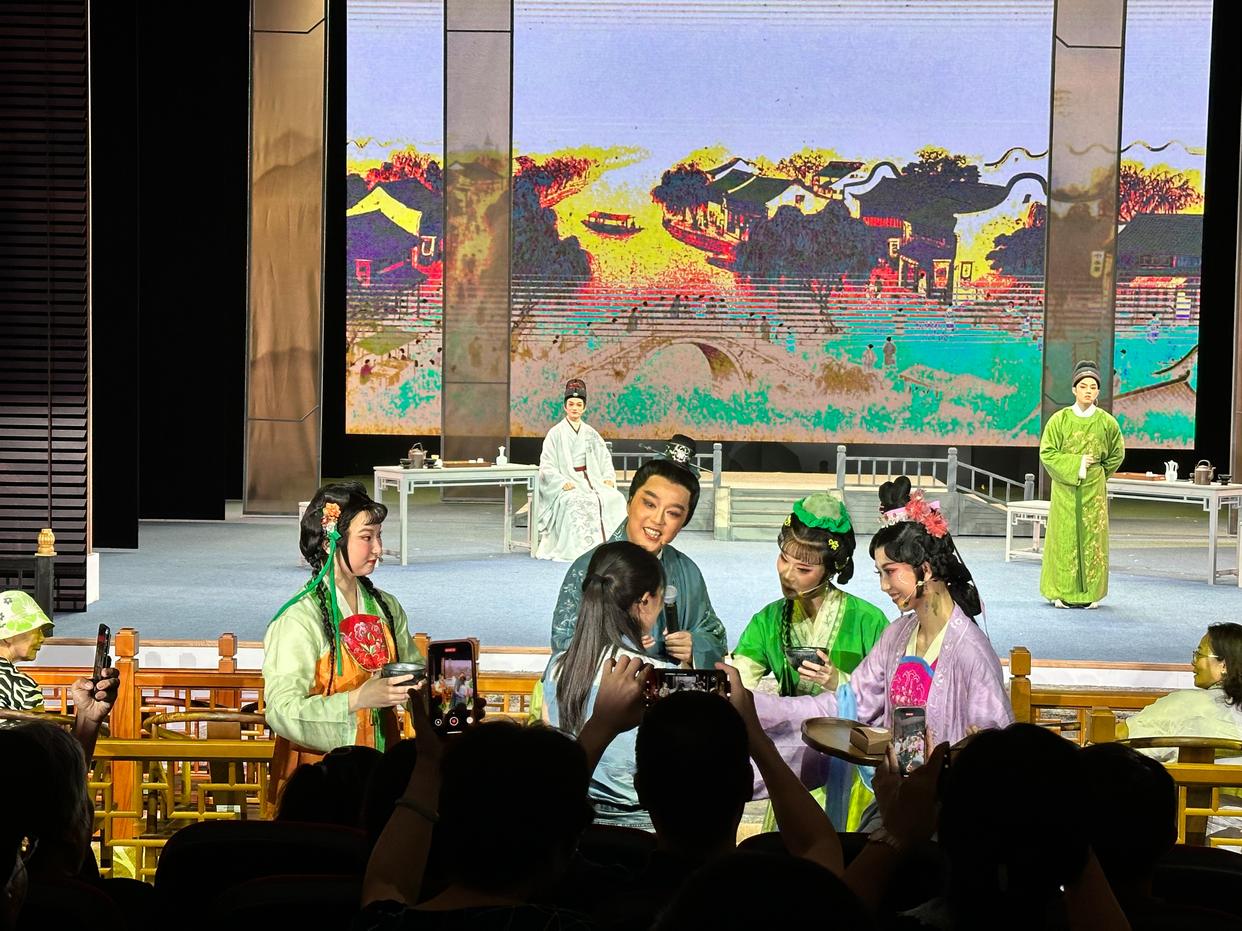 非遗闽剧融合点茶文化、福州“午时书”民俗、采莲鼓乐,以福州市花茉莉为魂,恰似精心打磨的“文化拼图”。演员们走下舞台与观众互动,打破观剧边界,让观众参与剧情走向,品茉莉花茶、行飞花令,从“旁观者”变成了“文化体验者”。