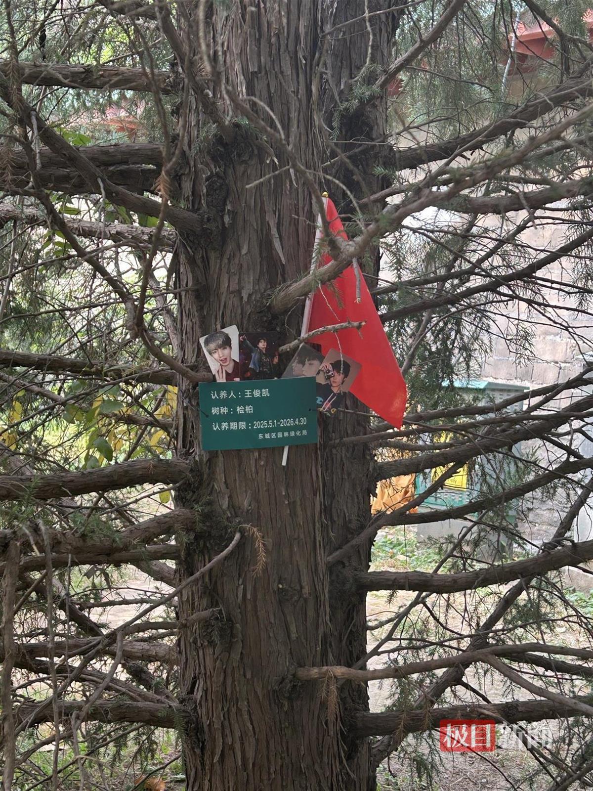 4日中午,记者来到北京市东城区的地坛公园看到,园内的不少树木都挂有绿色认养牌,认养时间均为一年。记者注意到,认养牌上的认养人一栏,除了“珞珈山的妙tree角”“双城姐妹2亿到账”等多个有趣的名字外,还有不少认养牌上写着明星的名字,比如在地坛北门附近,就有挂着王一博、王俊凯名字的认养树,在靠近方泽坛附近,还有挂着时代少年团、易烊千玺和周深名字的认养树。这些“明星树”吸引了不少粉丝前来打卡,还有粉丝带了明星的照片、应援钥匙扣、应援袖章、应援信等,并把这些应援物料挂在树的认养牌上合影。