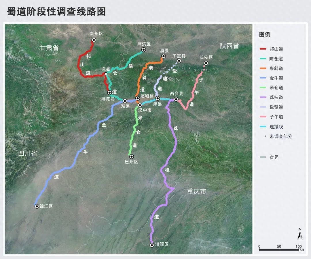 截至目前,考古人员已完成对金牛道、米仓道、荔枝道、陈仓道、褒斜道、祁山道共6条蜀道主线的基本情况,形成了目前最为准确的“蜀道数据”,迄今共调查蜀道里程2073千米,沿线分布各类文物遗存1034处,新发现文物遗存297处。