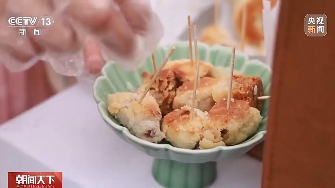 另一边,身着宋韵服饰的“茶仙子”们派发起了径山特色的素酱酥月饼,不少游客驻足品尝。