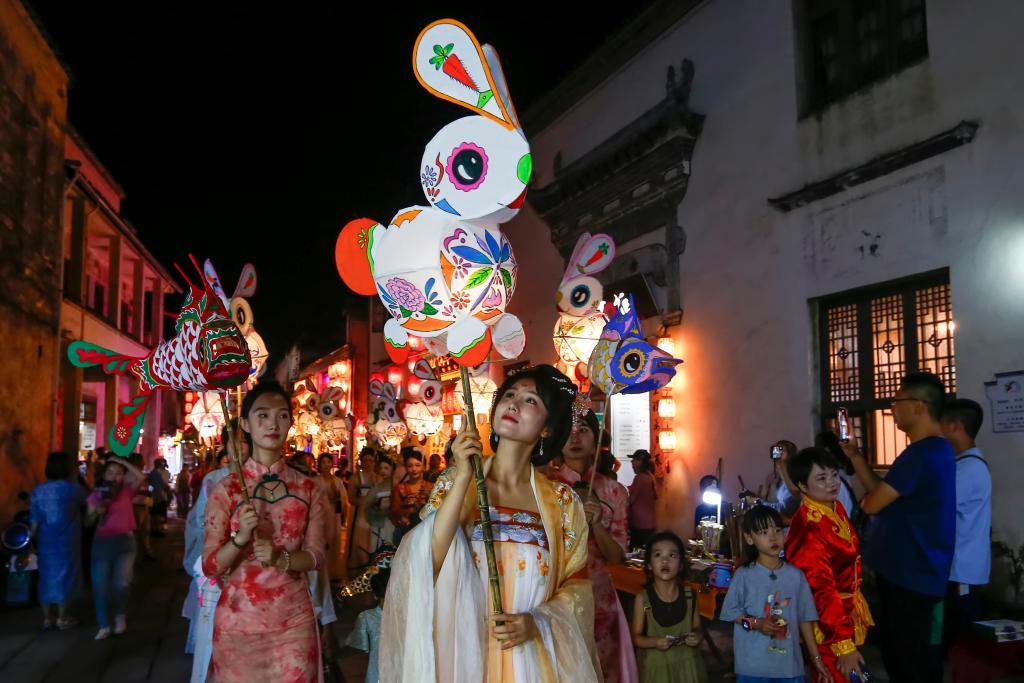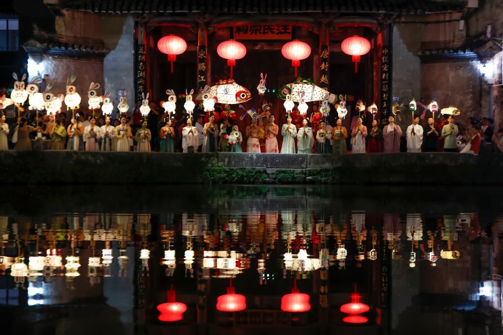 ↑在安徽省黄山市黟县宏村举行的中秋花灯巡游。CICPHOTO/施亚磊 摄