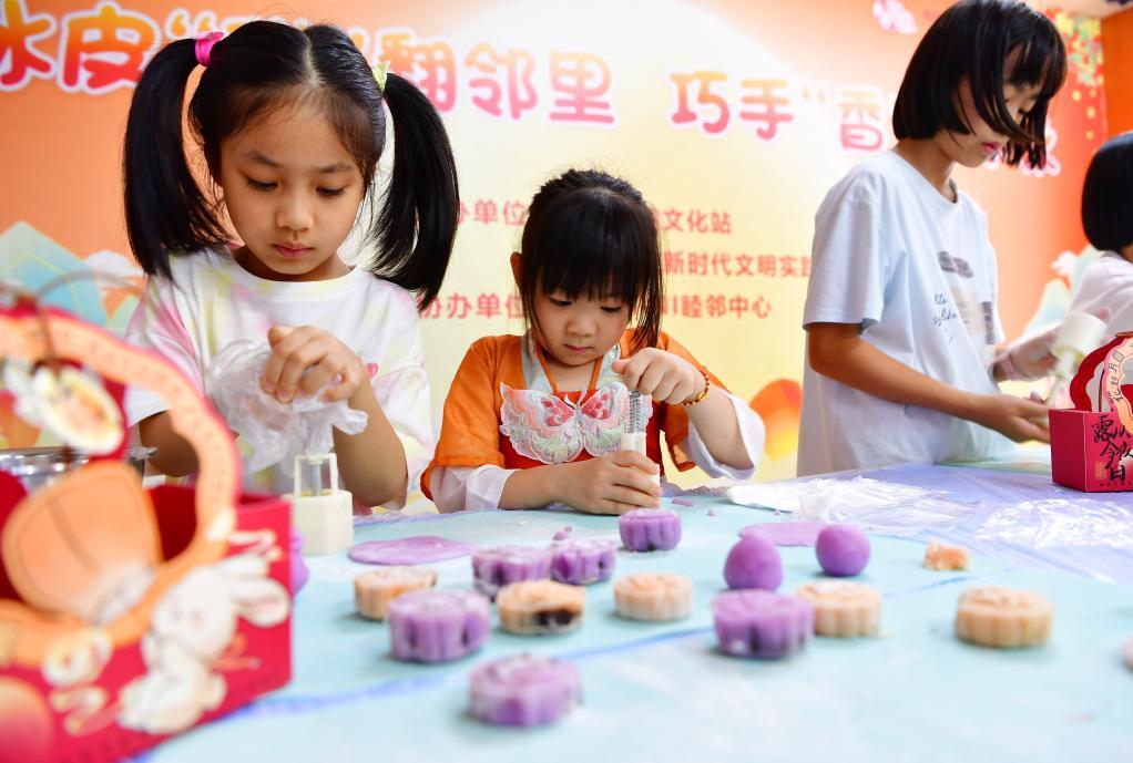 10月5日,在江苏省无锡经开区太湖街道方庙社区举办的迎中秋主题活动上,小朋友体验制作月饼。新华社发(还月亮摄)“一年逢好夜,万里见明时。”都说“月到中秋分外明”,早在唐朝时就兴起了赏月之风。临轩玩月、泛舟望月、饮酒对月……赏月是古人过中秋必不可少的节目。