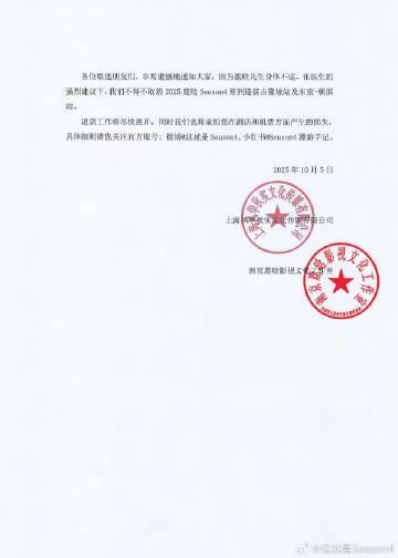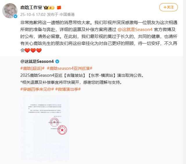 10月6日,@鹿晗工作室发布消息:非常抱歉将这一遗憾的消息带给大家。我们珍视并深深感激每一位朋友为这次相遇所做的准备与奔赴,详细的退票及补偿方案将通过 @这就是Season4官方微博及时公布,请务必留意。在此刻,我们最珍视的莫过于长久的、共同的健康,也请所有关心鹿晗先生的朋友们将这份牵挂化为对自己更好的照顾,待一切安好,不久再会。
