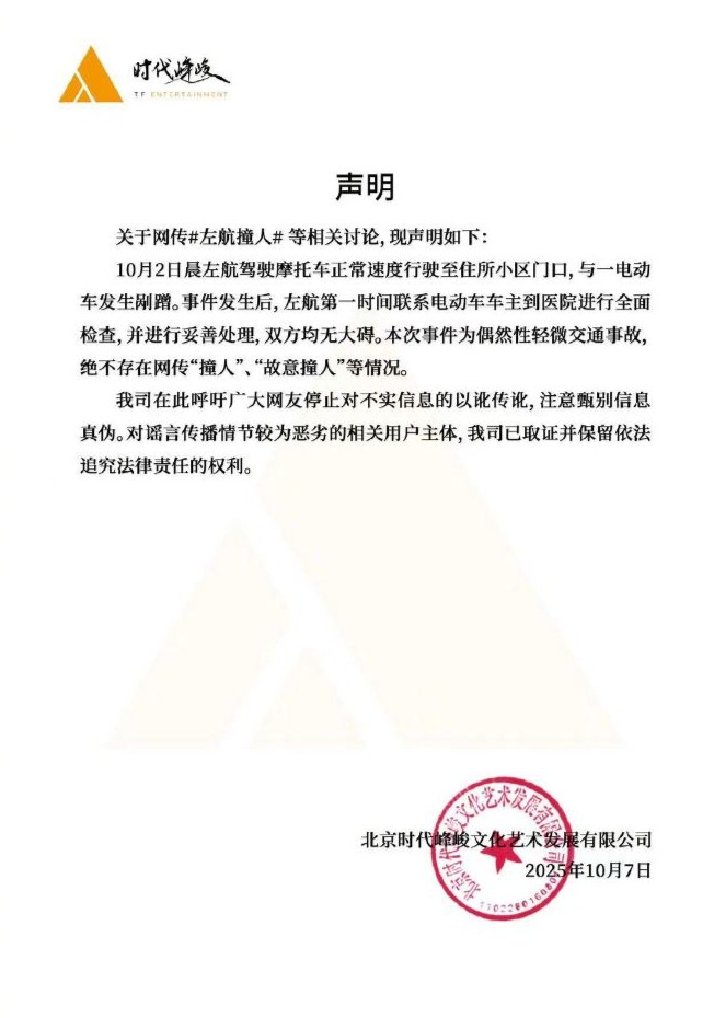10月2日晨左航驾驶摩托车正常速度行驶至住所小区门口,与一电动车发生刚蹭。事件发生后,左航第一时间联系电动车车主到医院进行全面检查,并进行妥善处理,双方均无大碍。本次事件为偶然性轻微交通事故,绝不存在网传“撞人”、“故意撞人”等情况。
