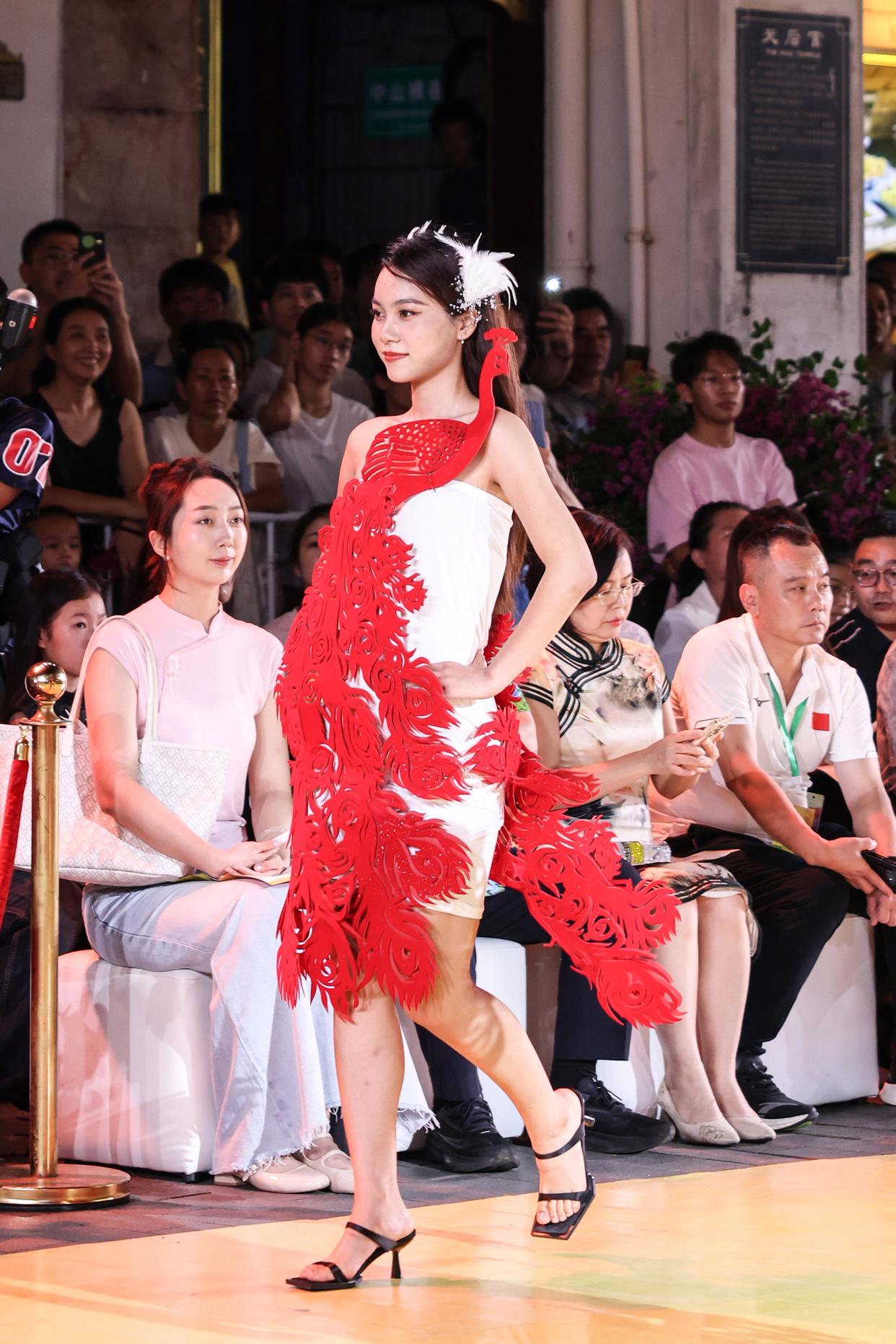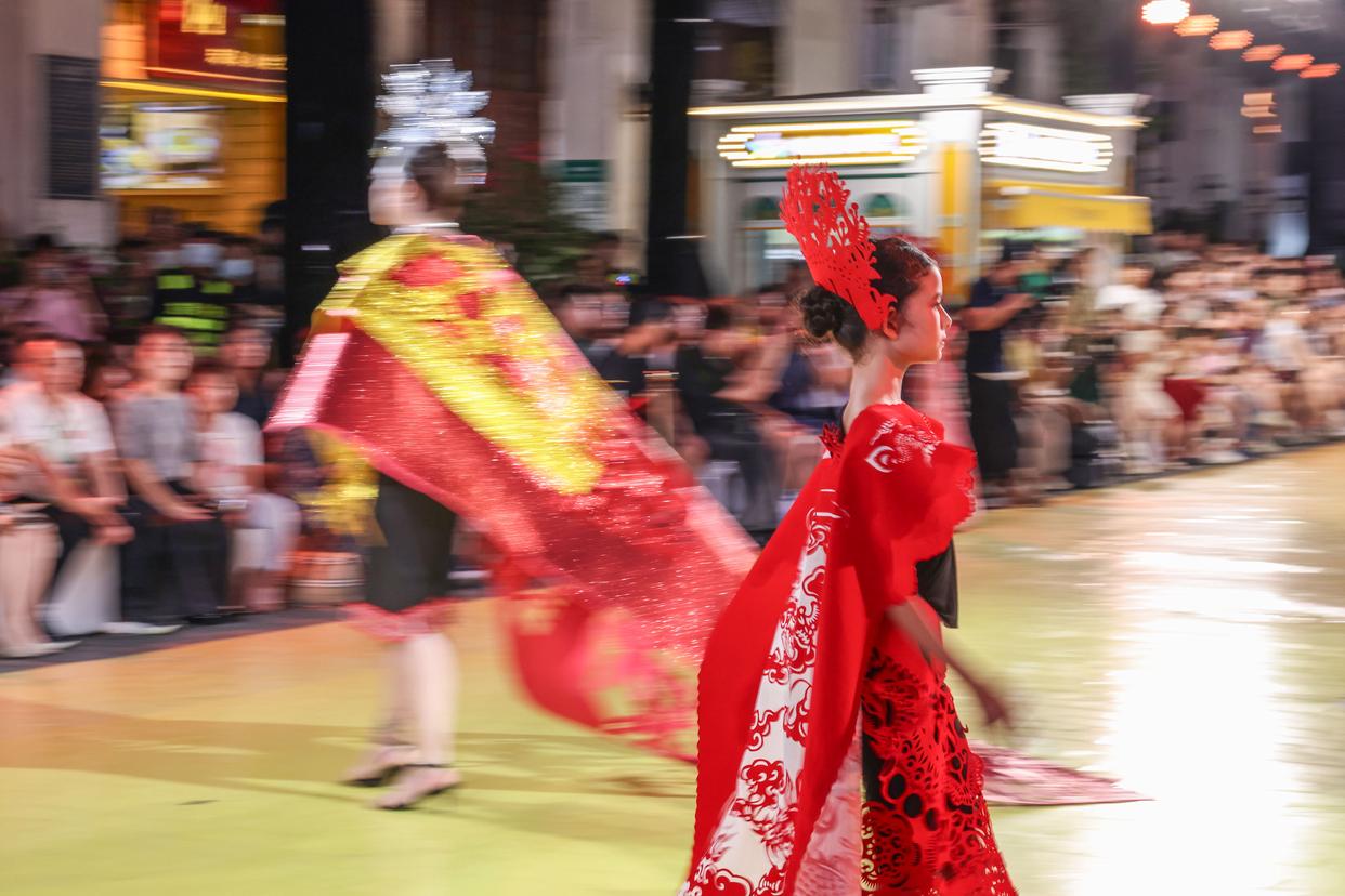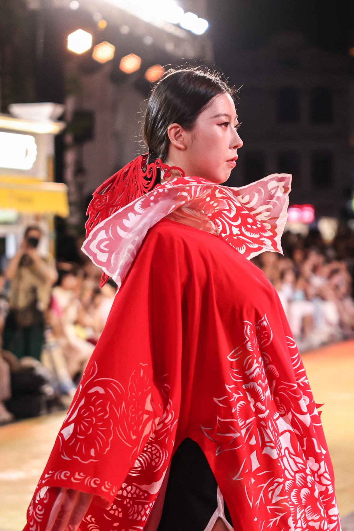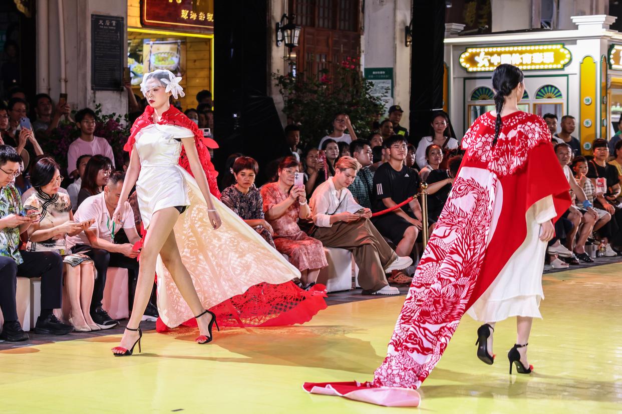 10月7日晚,作为2025海口艺术周系列活动之一,锦色·2025非遗潮秀在海口骑楼老街启幕。活动以“非遗再创”为核心,将剪纸艺术元素融入时装走秀。
