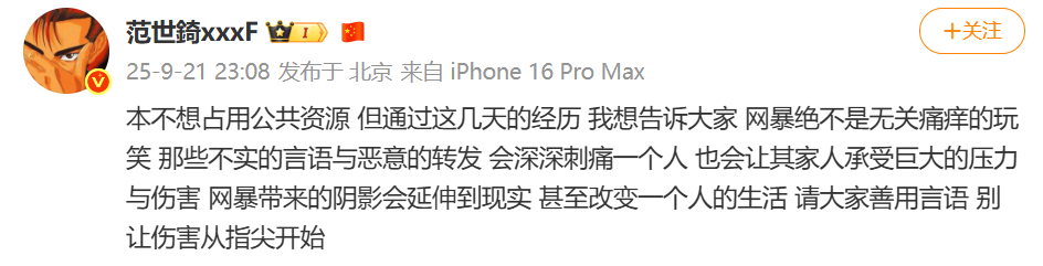 此前,9月11日,范世錡发博悼念好友于朦胧(2013年《快乐男声》同期选手),转发其演唱的《云中的Angel》并配文白色蜡烛符号,引发粉丝对两人“曲奇柠檬”友情怀念。随后网络出现谣言称范世錡与于朦胧坠楼事件有关,尽管警方通报确认坠亡为意外且排除其涉案,仍遭遇大规模网络暴力。