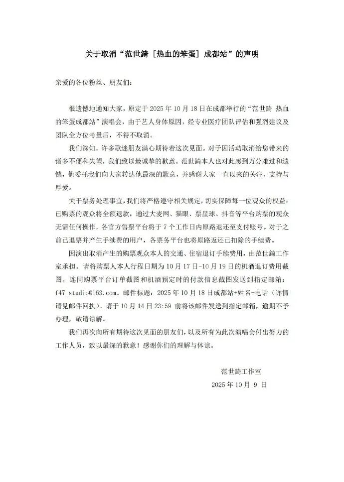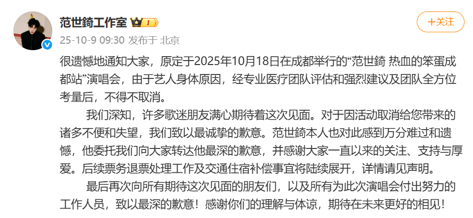 10月9日,男星范世錡工作室发布声明称:原定于2025年10月18日在成都举行的“范世錡 热血的笨蛋成都站”演唱会,由于艺人身体原因,经专业医疗团队评估和强烈建议及团队全方位考量后,不得不取消。后续票务退票处理工作及交通住宿补偿事宜将陆续展开。