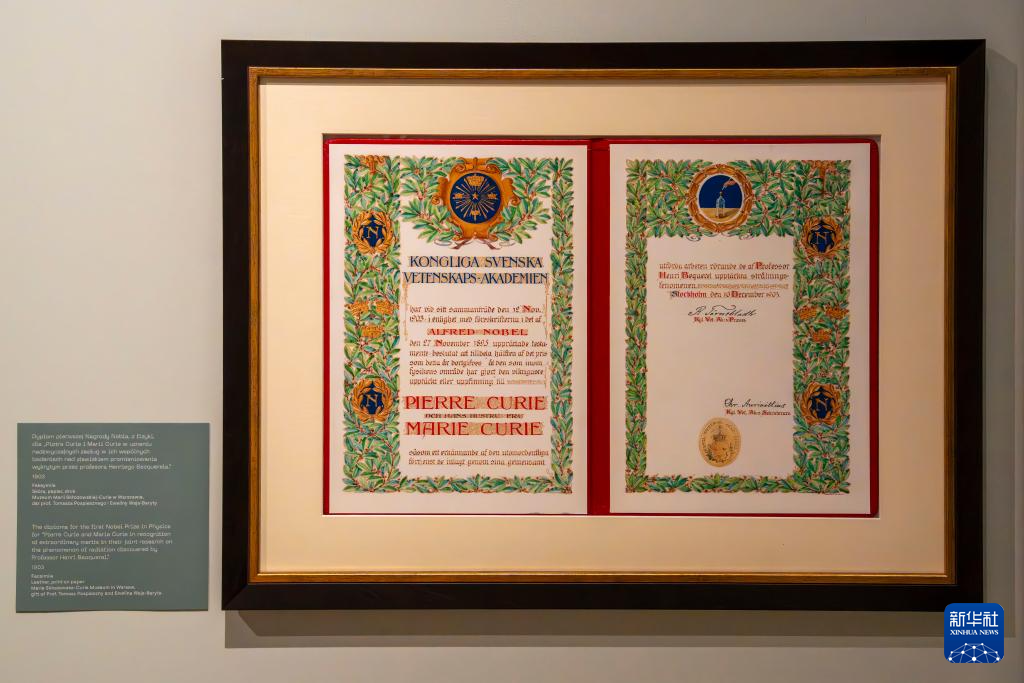 这是10月7日在波兰华沙的玛丽·斯克洛多夫斯卡-居里博物馆拍摄的居里夫妇1903年获得诺贝尔物理学奖的证书复制品。