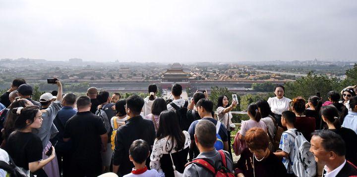 游人在北京景山公园观看故宫全景(2025年10月4日摄)。新华社记者 李欣 摄