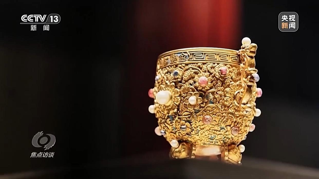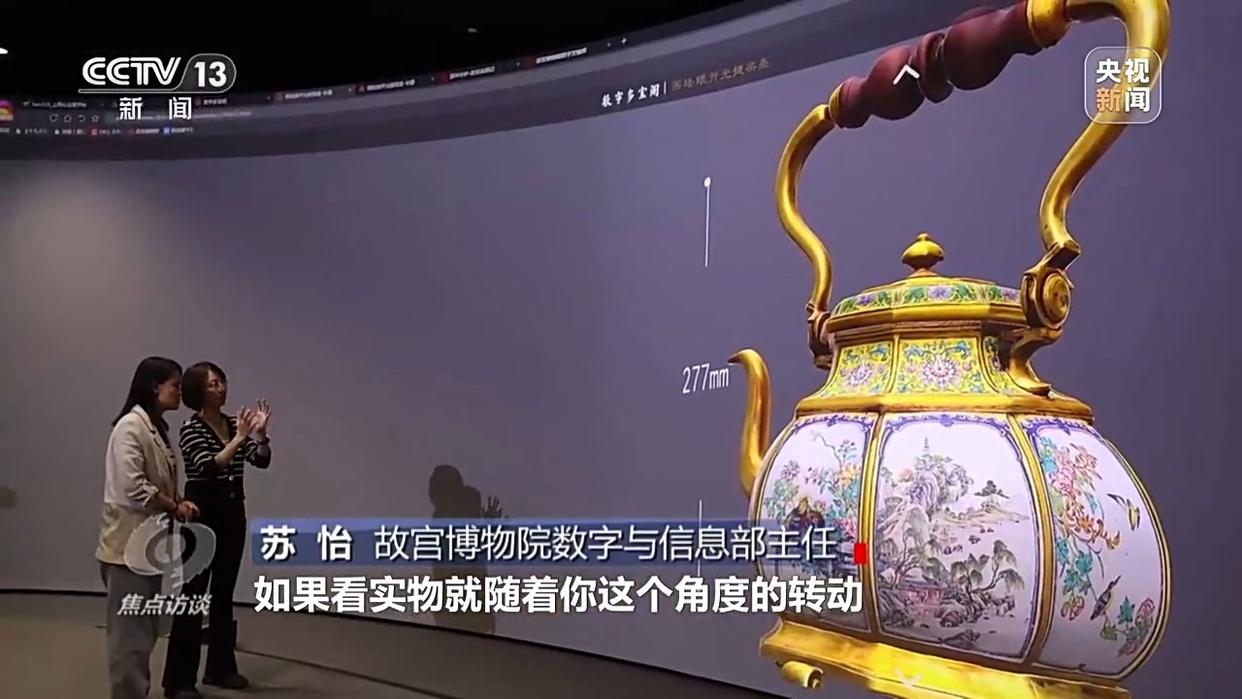 故宫博物院数字与信息部主任 苏怡:文物金属丝的部分,如果看实物,随着角度的转动、光线的变化上面金属的反光肯定会变,但是如果只是拍了一张照片,它是固定在一个时刻一个角度的,就不会产生真实文物的变化。用激光三维测量把它的形体准确地扫描下来,再用多个相机点位、很小间隔拍摄多张照片,这样在数字环境里打上特定的光源,才能够反映出和现实世界里看到一样的效果,掐丝会更亮一些。