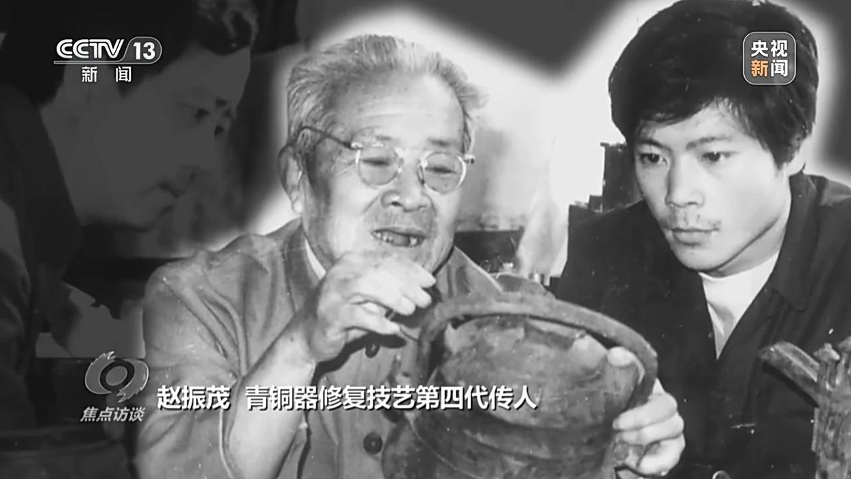 在王有亮工作桌上,一张黑白照片被精心摆在工具旁,照片上的人正是他的师父——青铜器修复技艺第四代传人赵振茂。这位业界泰斗以一双巧手让国宝“马踏飞燕”重现神采,至今仍是行业里的传奇。从赵振茂到王有亮,再到王有亮培养的第六代弟子,弟子培养的第七代弟子,师徒间的传承,让与时间对抗的修复技艺得以延续。